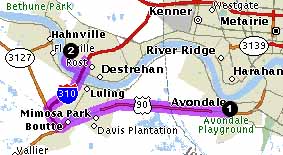 Destrehan High School Field Trip, Wednesday, September 20 EDCI 4993, Fall 2000 We will meet at Destrehan High School at our normal start time of 4:30 PM. See driving directions (from East and West banks) below. Anyone wishing to car pool from UNO should meet in front of the College of Education Building ... and be prepaired to leave UNO just before 4:00 PM. I, George, will be at UNO. Please eMail me if I should expect you to meet us for car pooling to Destrehan. My cell phone number is 957-5186, call if you are having problems. Once we are on campus, we will meet first in Dana's classroom. It is in the brick building to the far left facing Schexnayder Lane. Enter at the iron gate there -- you can see the gym through the gate. (Do not use the main entrance.) This is the Humanities Bldg. Once in the breezeway, my classroom is through the glass doors to the right. Rooom 104 -- first room on the left. I will post signs and be sure that people in the office are aware that you all are coming should you end up there somehow. Driving Directions, from East Bank