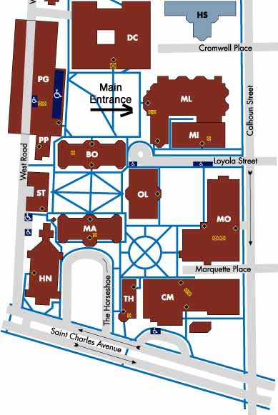 Loyola University Field Trip, Wednesday, March 7 Technology Integration, Spring 2001 We will meet at Loyola University at our normal start time of 4:30 PM in the J. Edgar and Louise S. Monroe Library (building ML on the map below). See driving directions below. Anyone wishing to car pool from UNO should meet in front of the College of Education Building ... and be prepared to leave UNO just before 4:00 PM. If you wish to meet at UNO, please eMail your intentions to George (gnorth@mac.com), or call -- 957-5186. A phone number for the school is not available. Loyola University is cornered by St. Charles Ave and Calhoun St. The J. Edgar and Louise S. Monroe Library in on Calhoun St. (building ML, see map below). We suggest you try parking on St. Charles Ave. or on Calhoun St. There is very limited public parking on Loyola St. (next to the Library, see map). Enter the Library building using the entrance marked on the map. The Main Entrance is oppoiste the side of the Library that faces Calhoun St. From Calhoun St., you can walk Loyola St. to the Main Entrance.