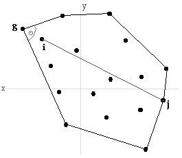 2. Point i is NOT on the hull implies that there is a point g, on the hull which forms an angle Q to which i is interior. This means that another line can be formed from point j to point g with length equal to | p g -p j | that is greater than | p i -p j |. | p i -p j | is NOT the largest distance between any two points in set S . This can be shown for a line between any two points when at least one point is not on the hull.