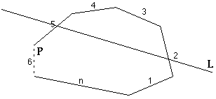 First , an ordered search is performed of the above set of edge pairs as follows: [1, n], [2, n-1], [3, n-2], ... , [n-n/2, n-((n+1)/2)+1] -- for example, with n = 7: [1,7], [2,6], [3,5]. This search is looking for ONE (at least) edge intersection of L . If both edges of a pair intersect L we are finished. If NO intersection is found in any pair, we are finished -- L does not intersect P .
