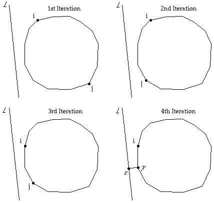 Note: From step one, we know that line L intersects one of the pair of edges ( i , j ), i < j - 1. Also it is known that the remaining edge intersection is one of the edges from i+1 to j-1.