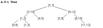 i) using the a component of intervals [ a , b ]: left children are less then right children, and ii) equal a components are ordered by length ( | b-a | ), shortest as left child.